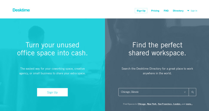 我們來看 Desktime 首頁的網頁布局,他們將頁面分為左右兩部分,左側用于滿足有空閑辦公室要出租的用戶,右側滿足還沒有自己的辦公室,要尋租的用戶。這將網站上兩個同樣重要的功能有效地展示了出來。