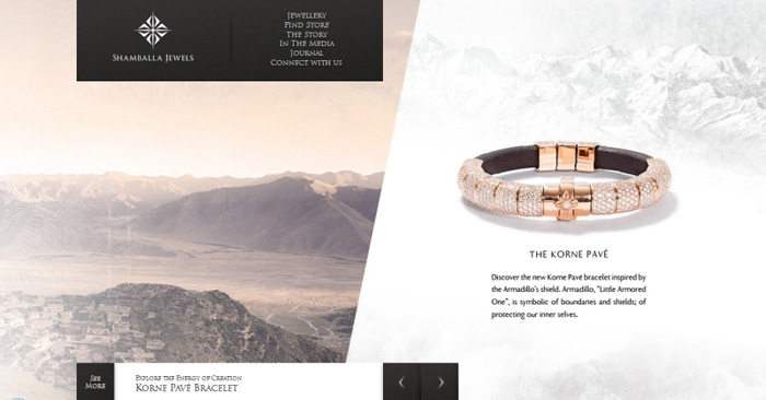 Shamballa Jewels 是一家經營珠寶首飾的公司,該網站用一個獨特頁面來展示他們的產品,這個頁面沒有滾動條,且完全充滿整個屏幕。