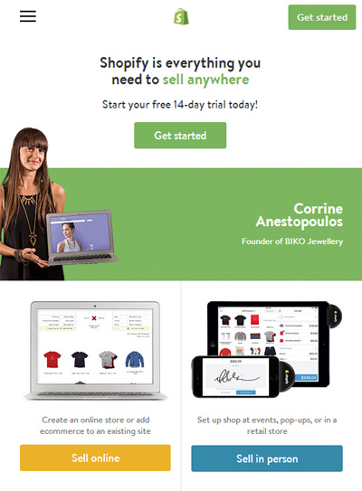 我們發現,Shopify 并沒有像 Amazon 一樣采用復雜的頁面布局,更沒有放置太多的內容在首頁,這使他們可以輕而易舉地實現響應式布局。簡潔的網站設計可以讓訪客以最快的速度找到自己想要的東西。