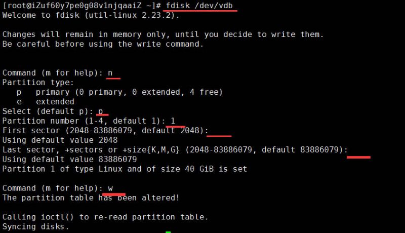 服務器只購買了一塊數據盤,所以我就全部用來做主分區(qū)了,如果你想把一個磁盤分成好幾塊,可以繼續(xù)按此命令分區(qū)即可;你可以繼續(xù)創(chuàng)建擴展分區(qū)......;